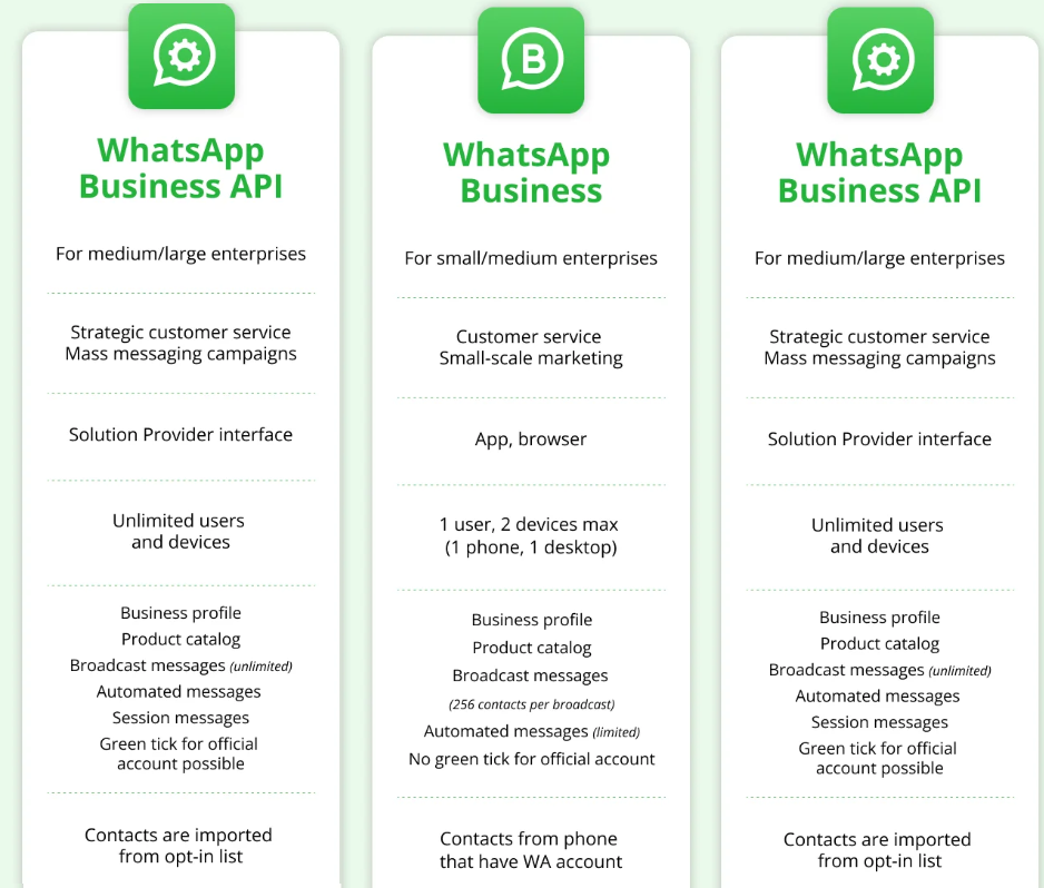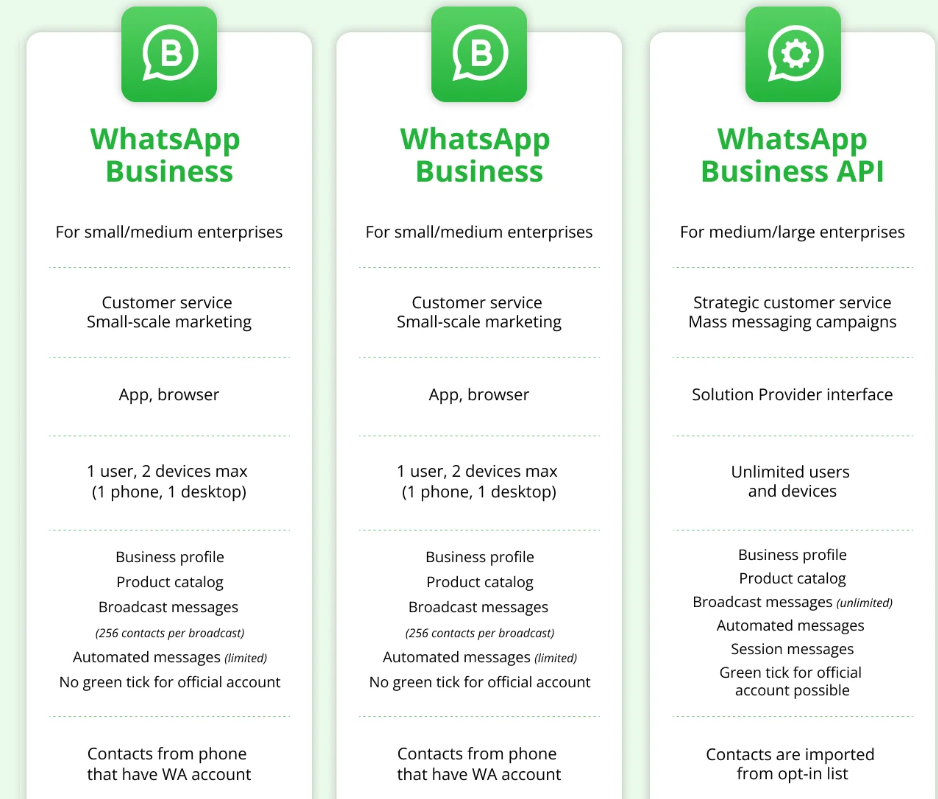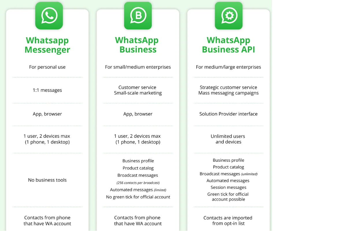 支持普通 WhatsApp、WhatsApp Business、及更高业务需求的 WhatsApp Business API。