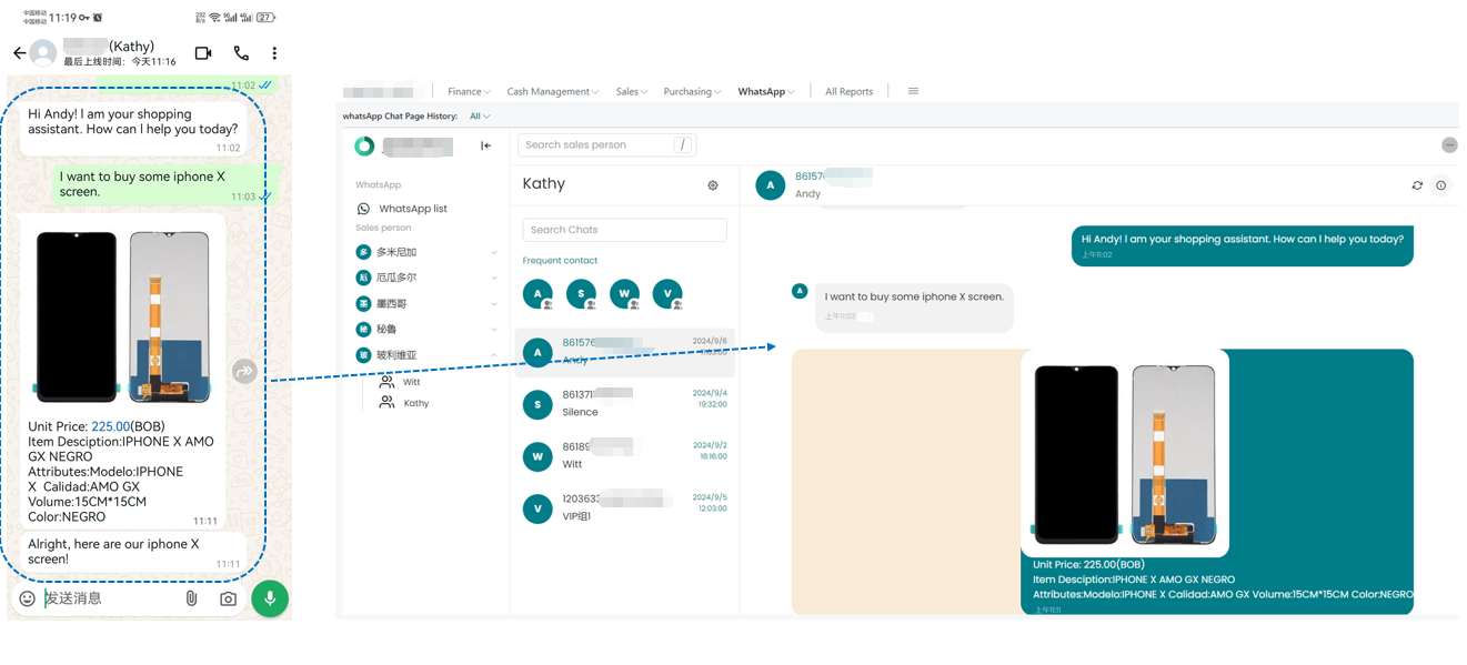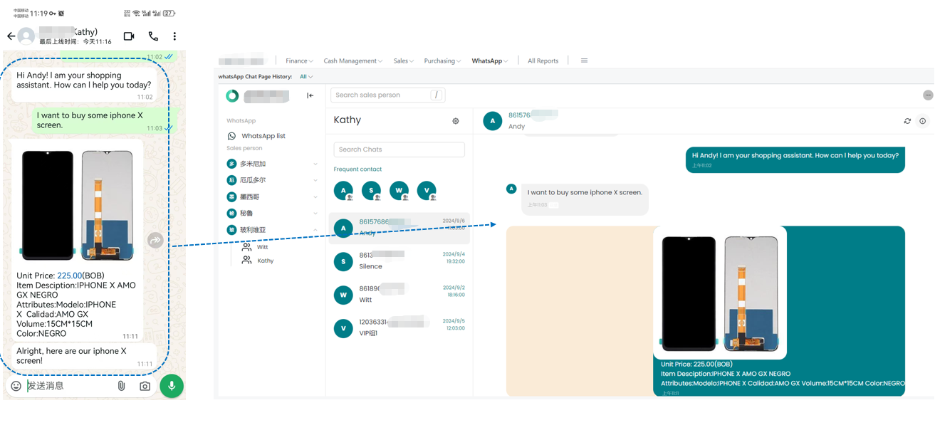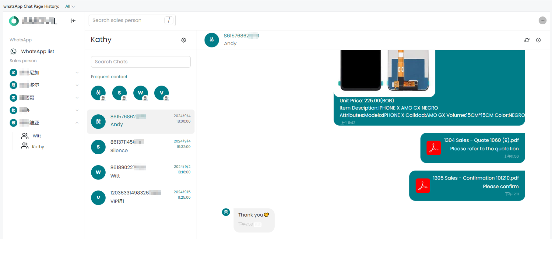 审计和可追溯性:让销售与客户的每一次沟通细节信息都成为公司数据资产,通过系统实时自动上传云端,所有 WhatsApp 消息(支持文字、图片、语音、视频、文件等)记录在 ERP 系统中,确保沟通透明且可审计。