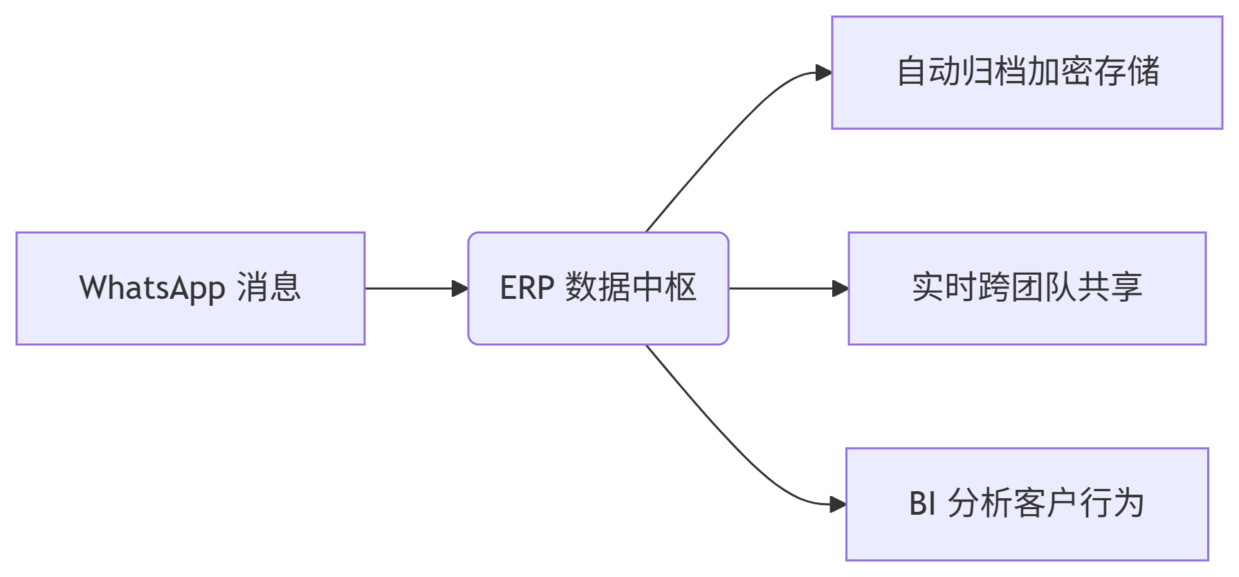 构建跨境电商核心沟通基建,WhatsApp 是跨境电商最主要的沟通工具,承担着交易闭环(咨询-支付-物流)、私域运营(群组/广播)和信任构建 三重角色。WhatsApp+ERP 的集成方案,面对海量的交互咨询进行智能分析及精细化管理,助力企业显著提高销售效率。
